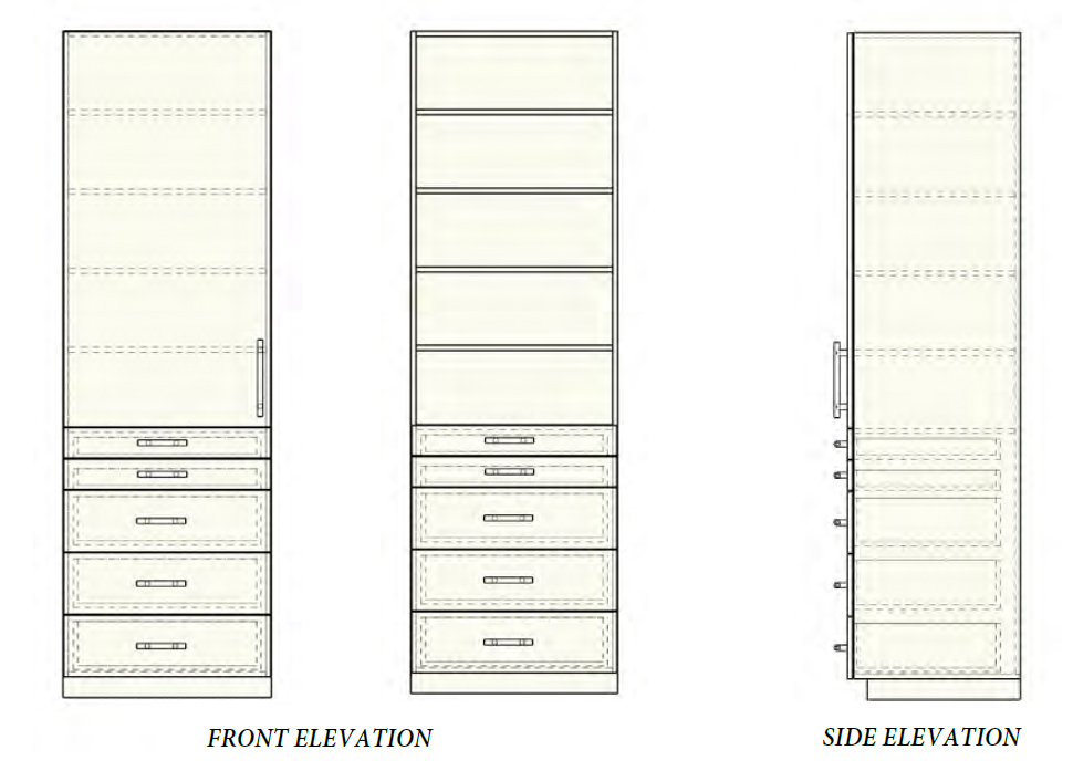 5 – Drawers and Open Adjustable Shelves***Open and with doorsSIZE CONSIDERATIONS:Height = Up to 96″HWidth = 18″W to 42″WDepth = 18″D to 24″DToekick = 3.5″